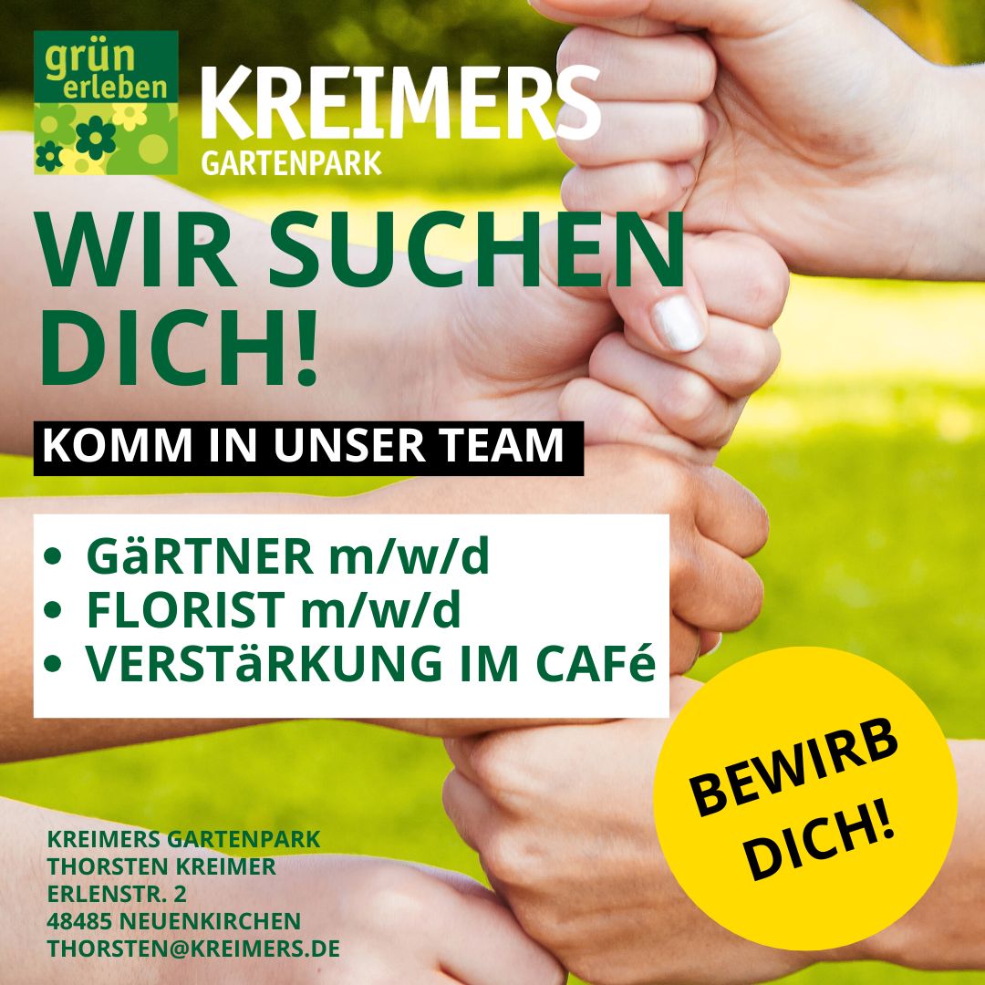 Auf insgesamt 40.000 qm führen wir ein riesiges Sortiment an Pflanzen für Beet, Balkon und Innenräume. Wir bringen Licht und Wasser in den Garten und Möbel, Schirme und Strandkörbe auf die Terrasse. Wir versorgen die Region mit besten Grills und bringen mit Gartenwerkzeug Ordnung in den Garten. Wir haben eine riesige Musterausstellung mit Gartenhäusern und Stauraumlösungen. Und in unserem ZOO&Co. KREIMERS finden Sie alles für Hund, Katze, Teichfische und Co. sowie die größte Aquaristik im Kreis Steinfurt.